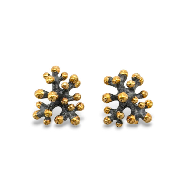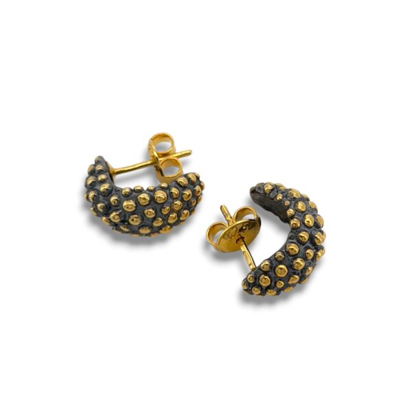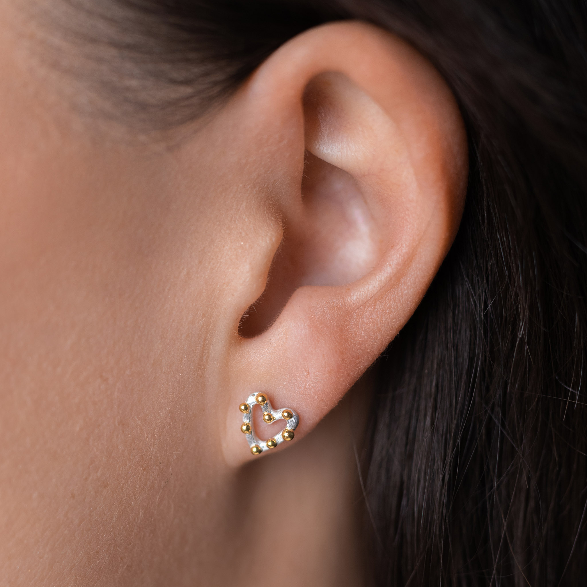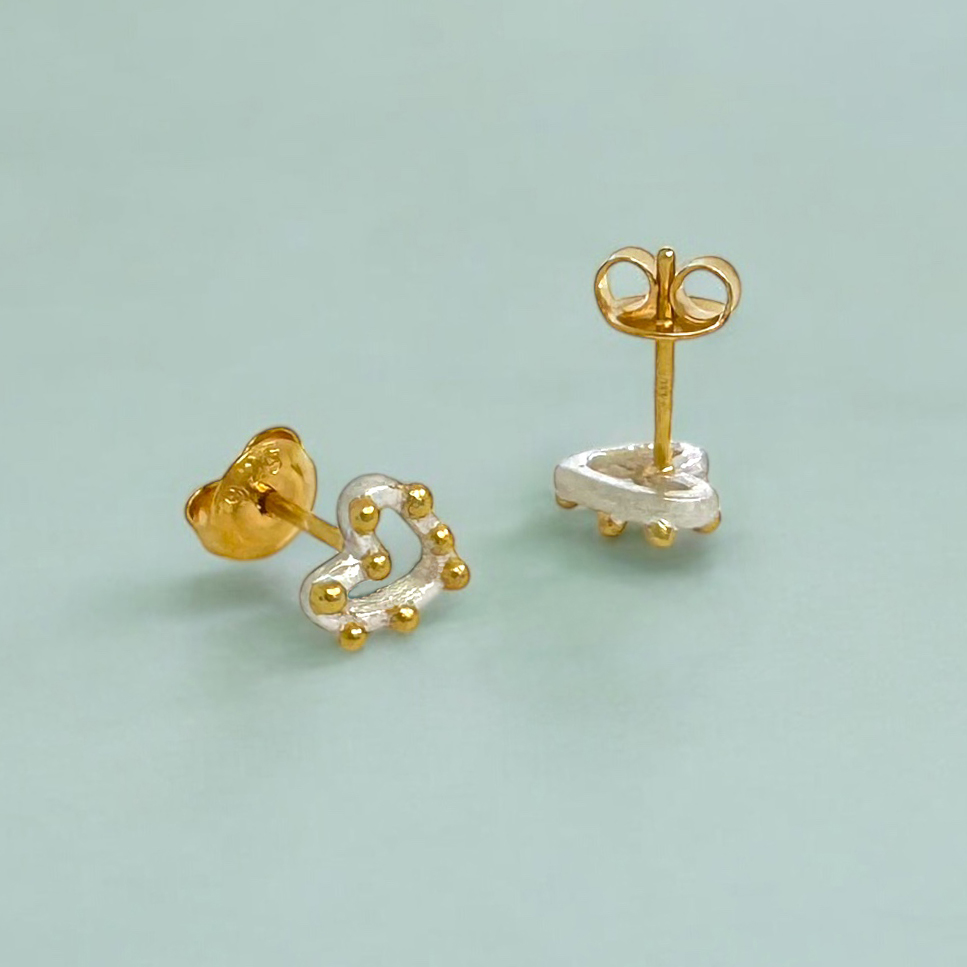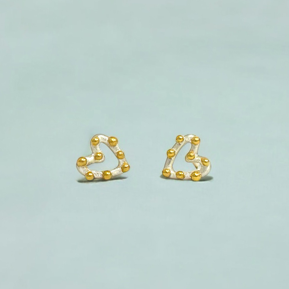 Sidabriniai širdelės formos auskarai simbolizuoja meilę, šilumą ir harmoniją, o maži aukso taškeliai suteikia papildomo spindesio ir žaismingumo.